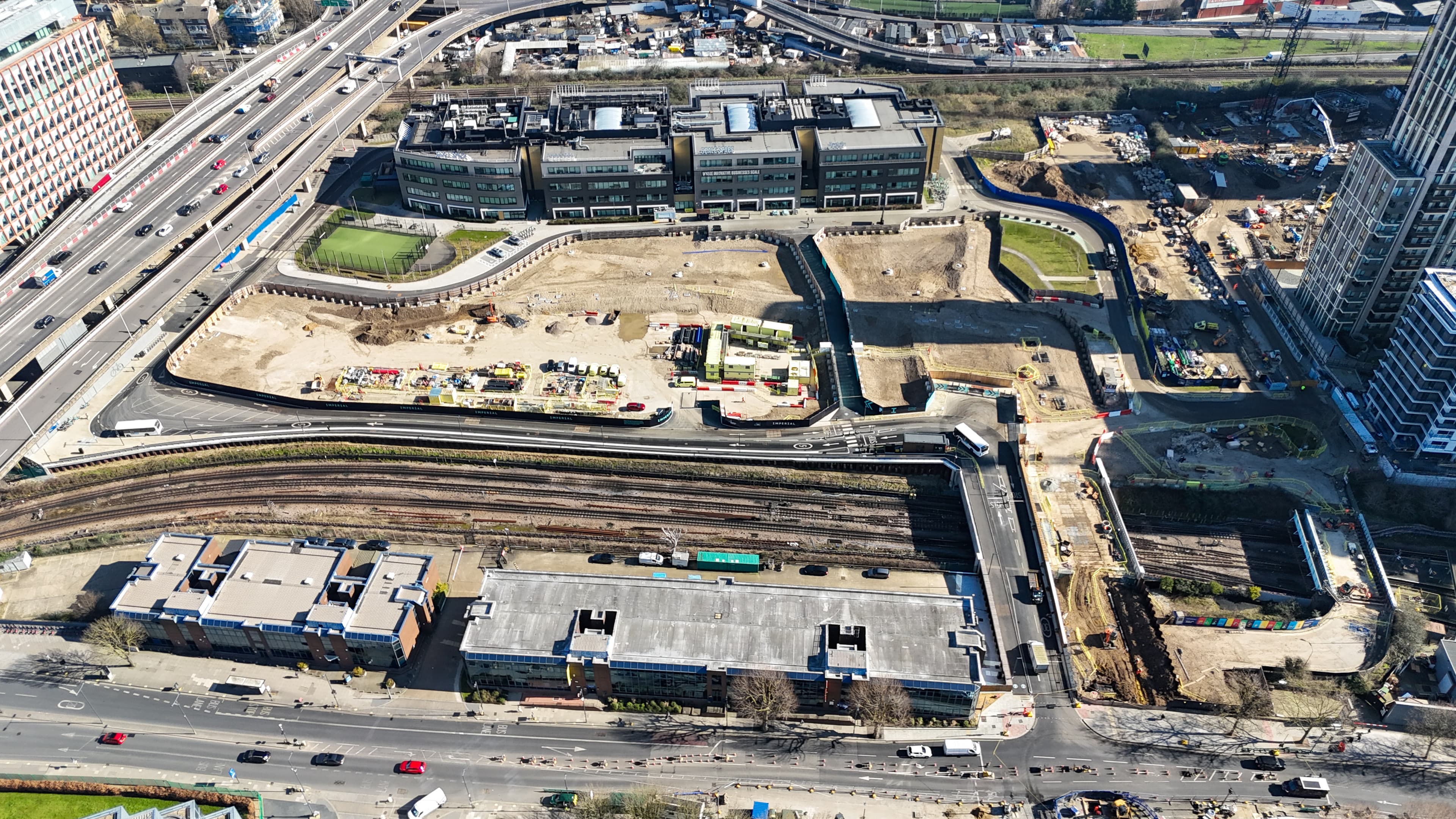 14-acre development of academic and business facilities at Imperial College’s White City campus. Civils included a sheet-piled retaining wall to the London Underground Limited (LUL) Central Line boundary, piled bridge abutments, a bridge deck over the line, demolition of a highway bridge, construction of a new highway network into the existing highway, substantial utility installations and diversions, a secant-piled basement box and extensive hard and soft landscaping.