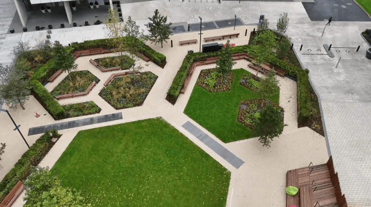 A timber podium seating structure is a key feature of the landscaping design. Designed in association with our specialist timber supplier, we self-delivered this structure. Uplighters and electrical connections were incorporated into the finished podium.